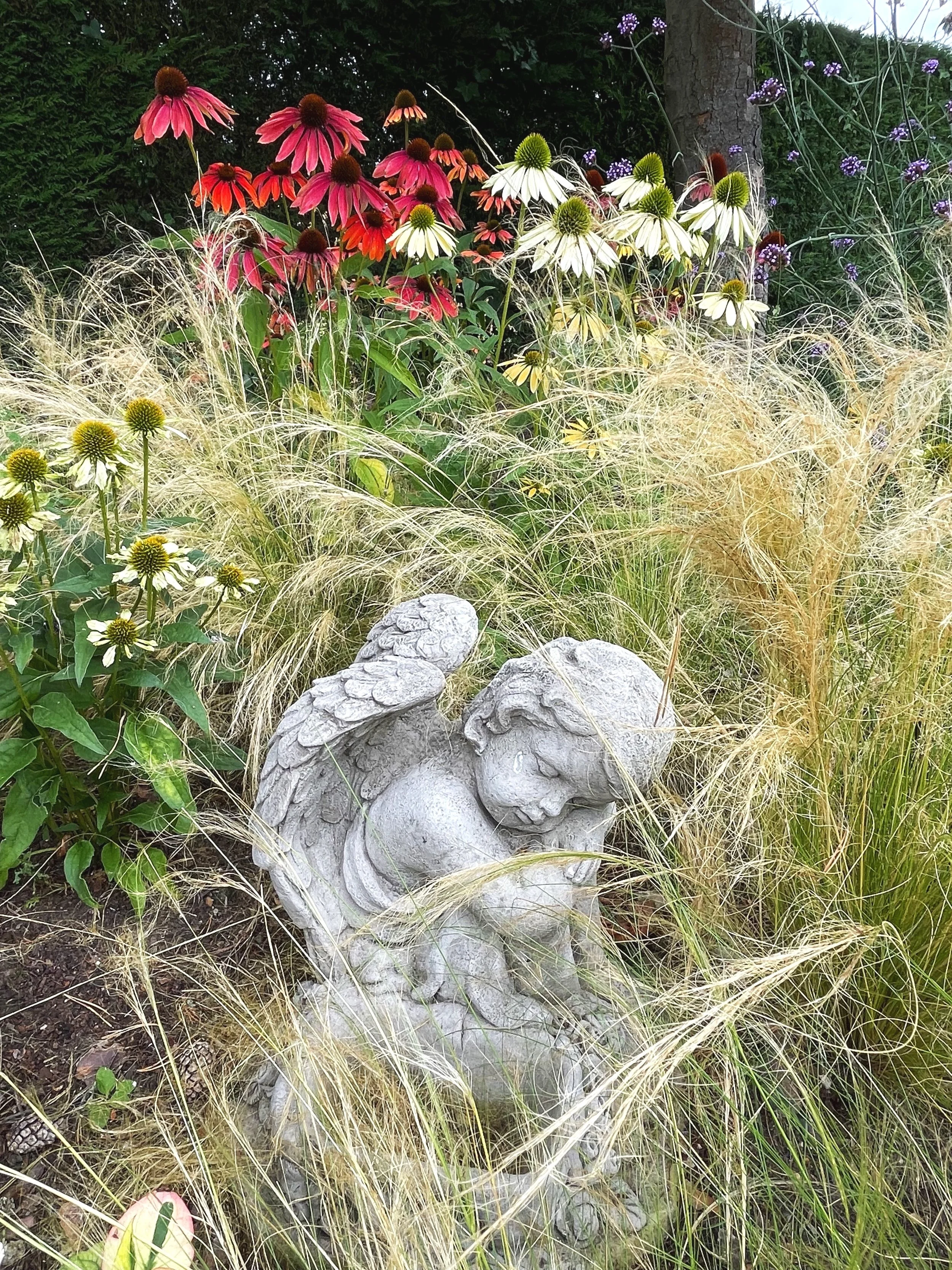 We included lots of attractive, memory-provoking and tactile features in the garden including: water feature, an angel sculpture, various animal and bird images, a beautiful apple tree, a wildflower meadow.