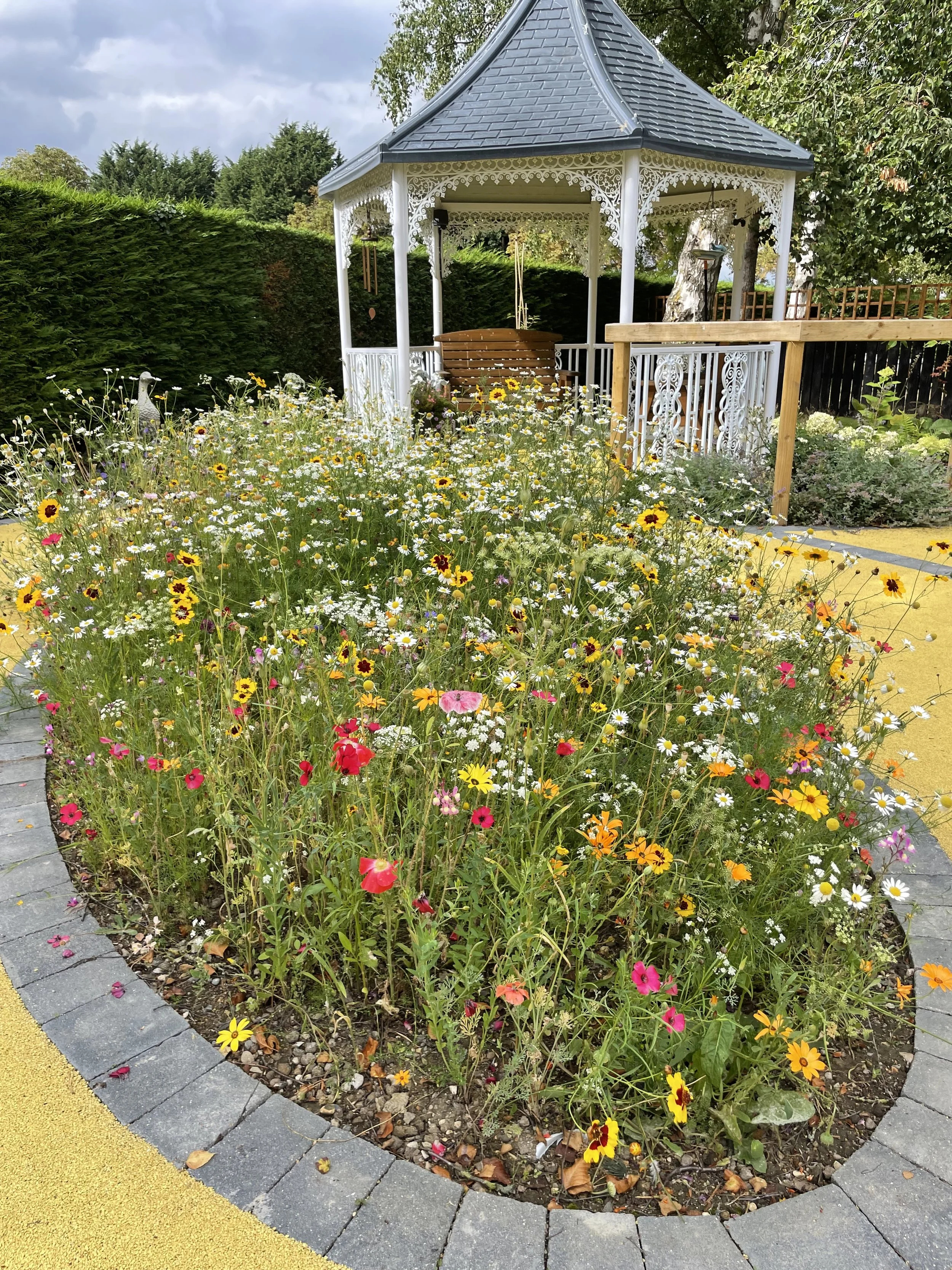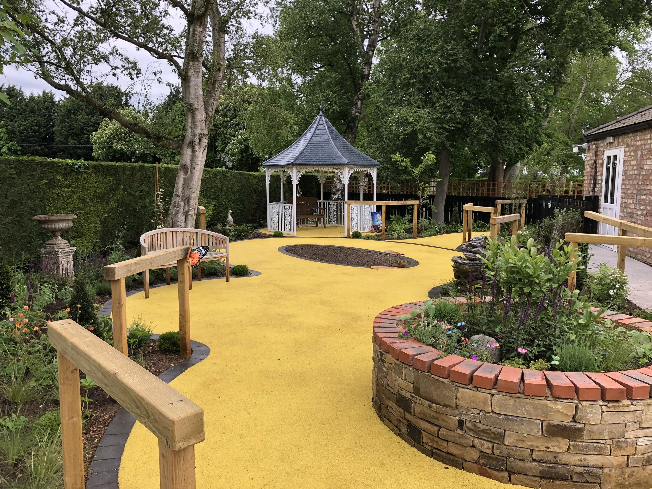 The design concept was to entice people outside with various appealing destinations at various distances from the dayroom. We positioned a pretty raised bed with beautiful fragranced and textured plants near the day room to entice people outside, then a water feature nearby a bit further into the garden, with a Victorian style gazebo as a final destination next to a new apple tree. A figure of eight looped path network (avoiding dead-ends for dementia patients) with a wet-pour yellow rubber path for ease of seeing the edge and cushioning in case of a fall. We also had carefully positioned hand rails around the garden and lots of interesting seating.