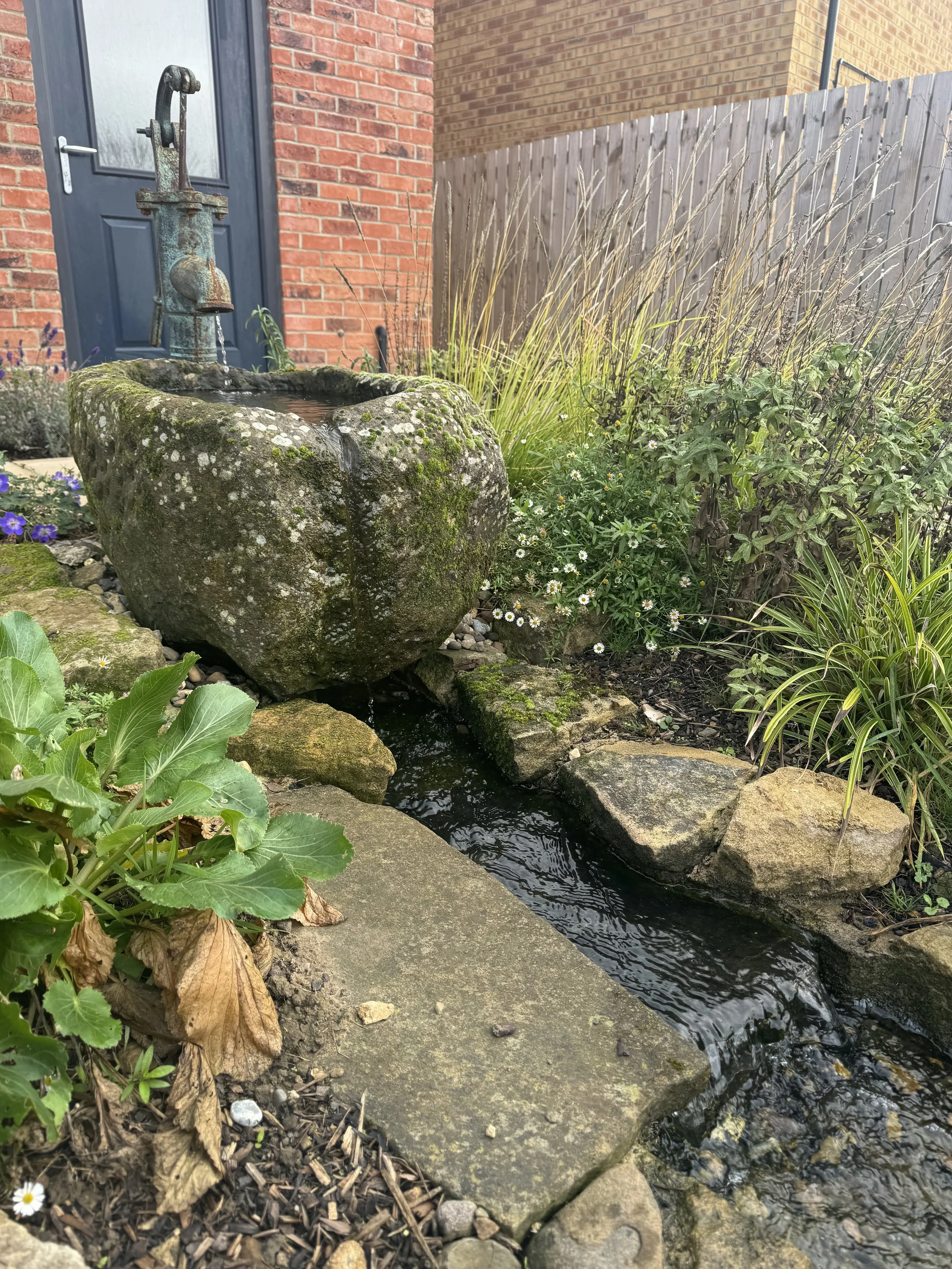 The scheme embraced the water as a main feature to the garden. We found a beautiful old water pump head and local old sandstone water trough as the source of the water feature, which then fell into a stream which flowed and fell through the planted middle garden into a 4m pond at the garden’s lowest point.